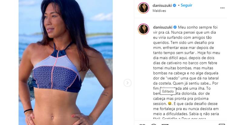 Danni Suzuki é arrastada para ilha enquanto surfa; confira o post da famosa: