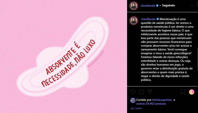Em seu perfil no Instagram, Claudia Raia fez um texto explicando a necessidade da distribuição do absorvente para mulheres carentes. “Menstruação é uma questão de saúde pública, ter acesso a produtos menstruais é um direito e uma necessidade de higiene básica. O que infelizmente acontece nesse país, é que boa parte das pessoas que menstruam não possuem recursos financeiros para comprar absorventes e/ou ter acesso a saneamento básico. Você consegue imaginar o risco a saúde ginecológica? Estamos falando de riscos infecções, esterilidade e outras doenças. Ou seja, são direitos humanos em jogo, o governo vetar a distribuição gratuita de absorventes a quem mais precisa é, negar o direito de dignidade e saúde pública”, escreveu a atriz.