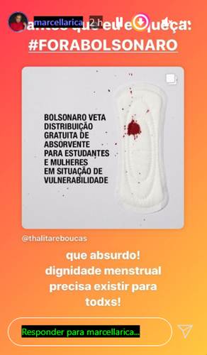 Várias artistas usaram as redes sociais para protestar contra o presidente Jair Bolsonaro depois do veto à distribuição gratuita de absorventes para mulheres em situação de vulnerabilidade e baixa renda. O veto do presidente foi publicado nesta quinta-feira (07) no Diário Oficial da União.