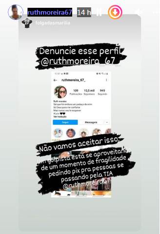 A publicação foi feita por uma página de fãs da artista e divulgada pela mãe dela. “Não vamos aceitar isso. Um golpista está se aproveitando de um momento de fragilidade pedindo PIX para pessoas se passando pela tia Ruth Moreira”, lê-se no post.