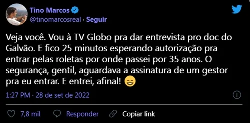 E fico 25 minutos esperando autorização pra entrar pelas roletas por onde passei por 35 anos. O segurança, gentil, aguardava a assinatura de um gestor pra eu entrar. E entrei, afinal”, escreveu em seu perfil no Twitter.