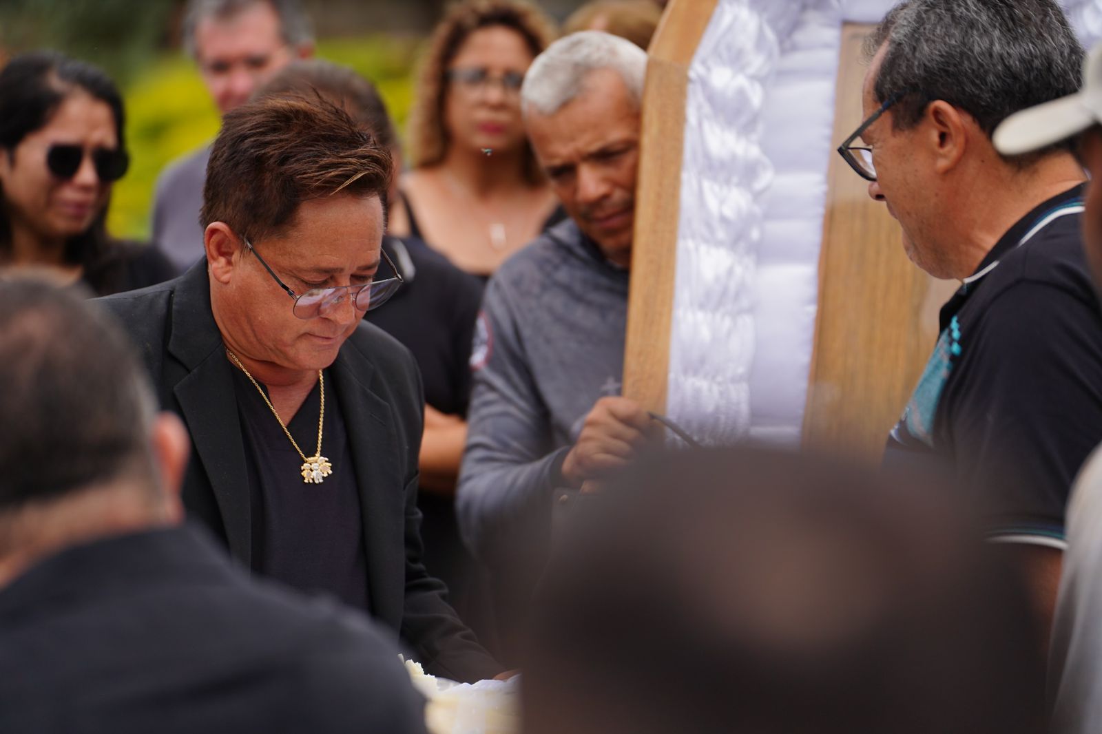 Leonardo e Poliana Rocha choram no enterro de Donna Carmen